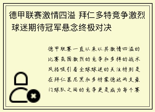 德甲联赛一直以来以其激情四溢的比赛氛围、激烈的竞争和多样的战术风格吸引着全球球迷的关注。特别是在拜仁慕尼黑和多特蒙德这两支豪门球队之间的竞争更是成为每个赛季的焦点。两队的强强对决无疑是德甲最具看点的赛...
