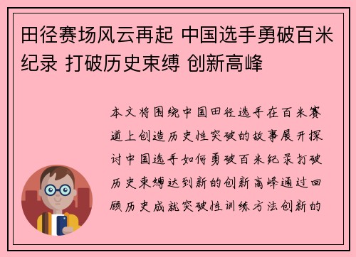 本文将围绕中国田径选手在百米赛道上创造历史性突破的故事展开,探讨中国选手如何勇破百米纪录,打破历史束缚,达到新的创新高峰。通过回顾历史成就、突破性训练方法、创新的科技支持以及文化背景的推动,本文将分析...