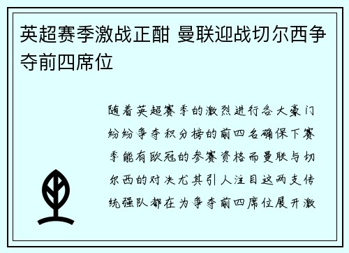 随着英超赛季的激烈进行,各大豪门纷纷争夺积分榜的前四名,确保下赛季能有欧冠的参赛资格。而曼联与切尔西的对决,尤其引人注目,这两支传统强队都在为争夺前四席位展开激烈竞争。无论是在球员阵容的调整,还是在战...