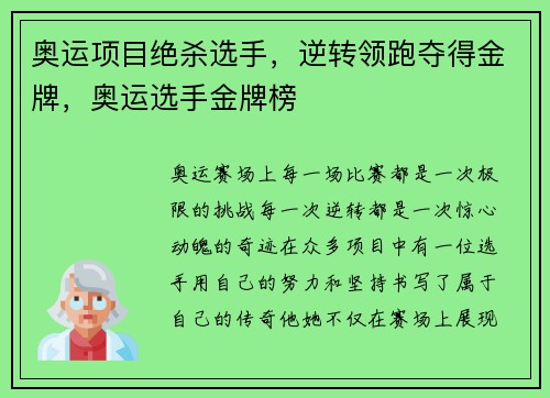 奥运赛场上,每一场比赛都是一次极限的挑战,每一次逆转都是一次惊心动魄的奇迹。在众多项目中,有一位选手用自己的努力和坚持,书写了属于自己的传奇。他/她不仅在赛场上展现了卓越的技术和战术,更在关键时刻以一...