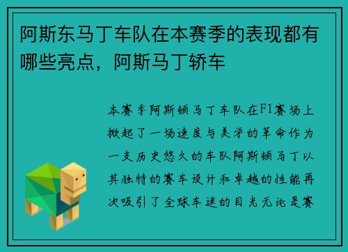 本赛季,阿斯顿马丁车队在F1赛场上掀起了一场“速度与美学”的革命。作为一支历史悠久的车队,阿斯顿马丁以其独特的赛车设计和卓越的性能再次吸引了全球车迷的目光。无论是赛道上的疾驰还是车迷心中的震撼,阿斯顿...