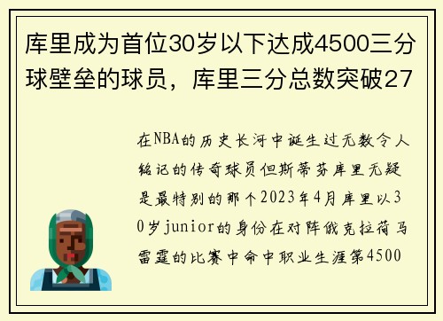 在NBA的历史长河中,诞生过无数令人铭记的传奇球员,但斯蒂芬·库里无疑是最特别的那个。2023年4月,库里以30岁“junior”的身份,在对阵俄克拉荷马雷霆的比赛中,命中职业生涯第4500记三分球,...
