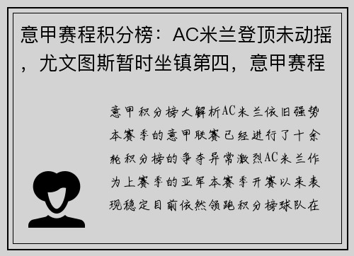 意甲积分榜大解析,AC米兰依旧强势 本赛季的意甲联赛已经进行了十余轮,积分榜的争夺异常激烈。AC米兰作为上赛季的亚军,本赛季开赛以来表现稳定,目前依然领跑积分榜。球队在联赛中的表现可以用“稳如泰山”来...