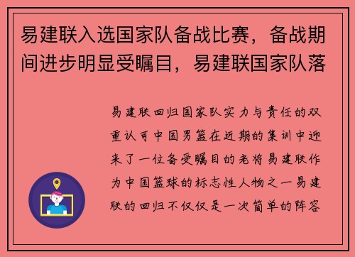 易建联回归国家队:实力与责任的双重认可 中国男篮在近期的集训中迎来了一位备受瞩目的老将——易建联。作为中国篮球的标志性人物之一,易建联的回归不仅仅是一次简单的阵容补强,更是对他在篮球领域深厚积累的认可...