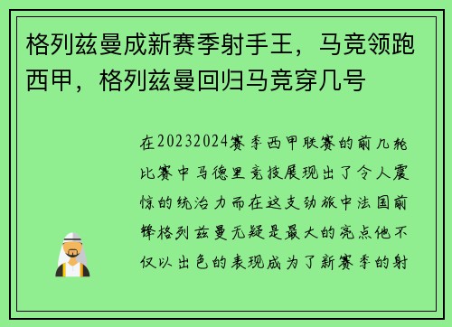 在2023-2024赛季西甲联赛的前几轮比赛中,马德里竞技展现出了令人震惊的统治力。而在这支劲旅中,法国前锋格列兹曼无疑是最大的亮点。他不仅以出色的表现成为了新赛季的射手王,更是凭借稳定的状态带领球队...