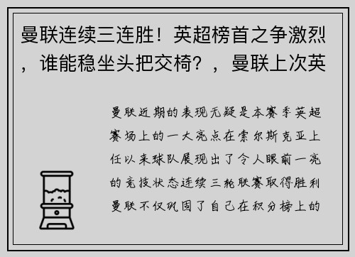 曼联近期的表现无疑是本赛季英超赛场上的一大亮点。在索尔斯克亚上任以来,球队展现出了令人眼前一亮的竞技状态。连续三轮联赛取得胜利,曼联不仅巩固了自己在积分榜上的位置,还向其他豪强发起了强有力的冲击。 从...