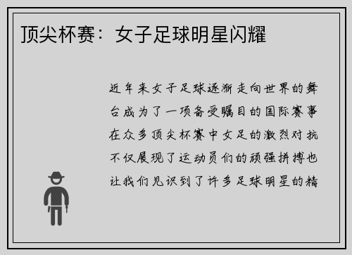 近年来,女子足球逐渐走向世界的舞台,成为了一项备受瞩目的国际赛事。在众多顶尖杯赛中,女足的激烈对抗不仅展现了运动员们的顽强拼搏,也让我们见识到了许多足球明星的精彩表现。从世界杯到奥运会,从欧洲杯到亚洲...
