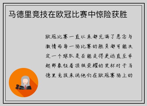 欧冠比赛一直以来都充满了悬念与激情,而每一场比赛的胜负都可能决定一个球队是否能走得更远,直至举起那象征着顶级荣耀的奖杯。对于马德里竞技来说,他们在欧冠赛场上的每一次征战,似乎都充满了挑战与考验。尤其是...