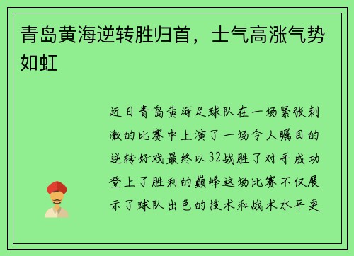 近日,青岛黄海足球队在一场紧张刺激的比赛中上演了一场令人瞩目的逆转好戏,最终以3-2战胜了对手,成功登上了胜利的巅峰。这场比赛不仅展示了球队出色的技术和战术水平,更是体现了青岛黄海队员们顽强拼搏的精神...