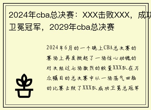 2024年6月的一个晚上,CBA总决赛的赛场上再度掀起了一场惊心动魄的对决。经过七场激烈的较量,XXX队在万众瞩目的总决赛中,以一场荡气回肠的比赛击败了XXX队,成功卫冕总冠军!这是XXX队在CBA历...