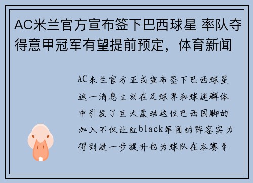 AC米兰官方正式宣布签下巴西球星,这一消息立刻在足球界和球迷群体中引发了巨大轰动。这位巴西国脚的加入,不仅让红-black军团的阵容实力得到进一步提升,也为球队在本赛季争夺意甲冠军注入了更强的信心。近...