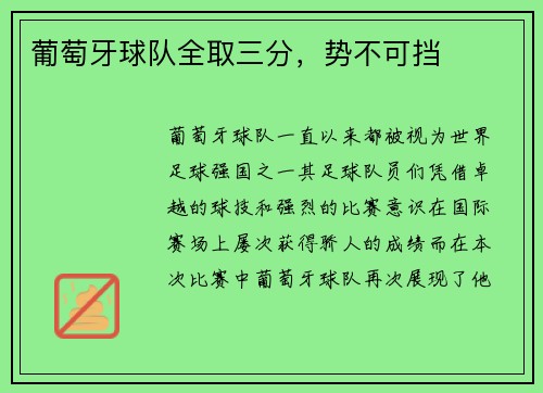 葡萄牙球队一直以来都被视为世界足球强国之一,其足球队员们凭借卓越的球技和强烈的比赛意识,在国际赛场上屡次获得骄人的成绩。而在本次比赛中,葡萄牙球队再次展现了他们的实力,以令人瞩目的表现,成功全取三分,...