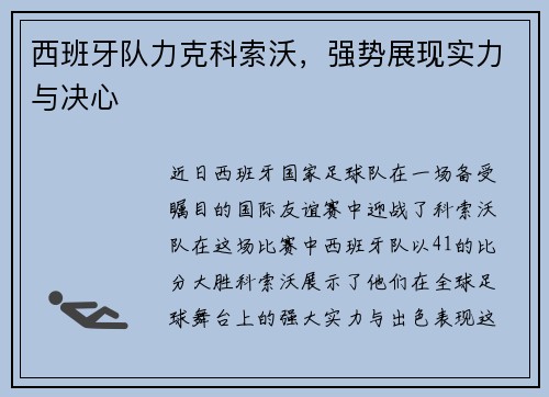 近日,西班牙国家足球队在一场备受瞩目的国际友谊赛中迎战了科索沃队。在这场比赛中,西班牙队以4-1的比分大胜科索沃,展示了他们在全球足球舞台上的强大实力与出色表现。这场比赛不仅是一场普通的友谊赛,更是西...