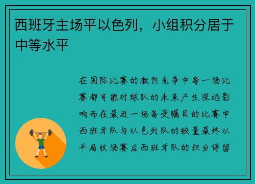 在国际比赛的激烈竞争中,每一场比赛都可能对球队的未来产生深远影响。而在最近一场备受瞩目的比赛中,西班牙队与以色列队的较量最终以平局收场。赛后,西班牙队的积分停留在小组中等位置,这一结果无疑让广大球迷感...