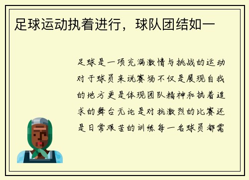 足球是一项充满激情与挑战的运动。对于球员来说,赛场不仅是展现自我的地方,更是体现团队精神和执着追求的舞台。无论是对抗激烈的比赛,还是日常艰苦的训练,每一名球员都需要将个人的努力融入到团队的整体协作中,...