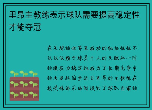 在足球的世界里,成功的秘诀往往不仅仅依赖于球员个人的天赋和一时的爆发力,稳定性成为了长期竞争中的决定性因素。近日,里昂的主教练在接受媒体采访时谈到了球队当前的表现,重点提到了提高稳定性是球队冲击冠军的...