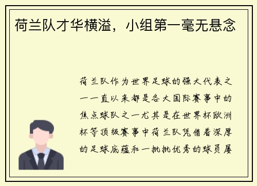 荷兰队作为世界足球的强大代表之一,一直以来都是各大国际赛事中的焦点球队之一。尤其是在世界杯、欧洲杯等顶级赛事中,荷兰队凭借着深厚的足球底蕴和一批批优秀的球员,屡次打破对手的防线,取得了不小的成就。如今...