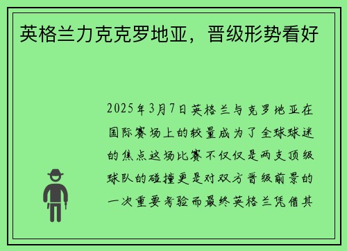 2025年3月7日,英格兰与克罗地亚在国际赛场上的较量成为了全球球迷的焦点。这场比赛不仅仅是两支顶级球队的碰撞,更是对双方晋级前景的一次重要考验。而最终,英格兰凭借其出色的团队协作和关键时刻的表现,以...