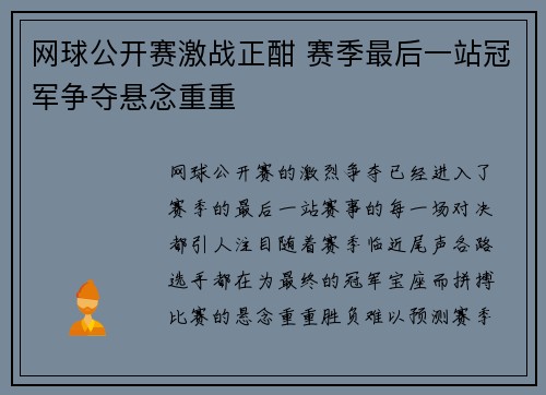 网球公开赛的激烈争夺已经进入了赛季的最后一站,赛事的每一场对决都引人注目。随着赛季临近尾声,各路选手都在为最终的冠军宝座而拼搏,比赛的悬念重重,胜负难以预测。赛季最后一站的冠军争夺战不仅仅是技术的比拼...