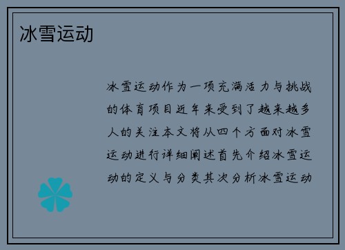 冰雪运动作为一项充满活力与挑战的体育项目,近年来受到了越来越多人的关注。本文将从四个方面对冰雪运动进行详细阐述:首先,介绍冰雪运动的定义与分类,其次分析冰雪运动的历史发展,再者讨论冰雪运动的身体健康效...