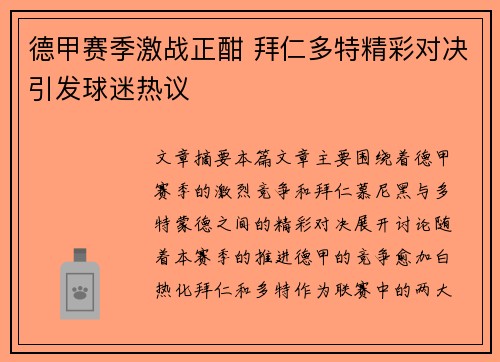 文章摘要:本篇文章主要围绕着德甲赛季的激烈竞争和拜仁慕尼黑与多特蒙德之间的精彩对决展开讨论。随着本赛季的推进,德甲的竞争愈加白热化,拜仁和多特作为联赛中的两大传统强队,其之间的较量成为了球迷热议的焦点...