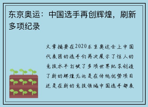 文章摘要:在2020东京奥运会上,中国代表团的选手们再次展示了惊人的竞技水平,打破了多项世界纪录,创造了新的辉煌。无论是在传统优势项目,还是在新的竞技领域,中国选手都表现出了强大的实力和不屈的精神。这...