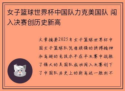 文章摘要: 2025年女子篮球世界杯,中国女子篮球队凭借顽强的拼搏精神和高超的竞技水平,在半决赛中战胜了强大的美国队,成功闯入决赛,创下了中国队历史上的新高。这一胜利不仅是中国女篮的历史性突破,更象征...