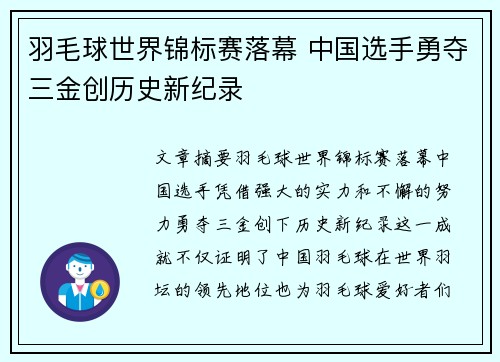 文章摘要:羽毛球世界锦标赛落幕,中国选手凭借强大的实力和不懈的努力,勇夺三金,创下历史新纪录。这一成就不仅证明了中国羽毛球在世界羽坛的领先地位,也为羽毛球爱好者们带来了无限的荣耀与自豪。本文将从多个方...
