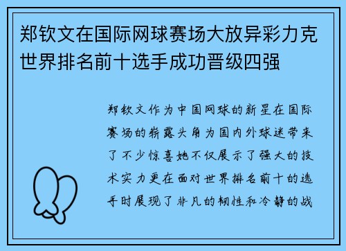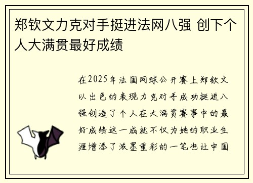 文章摘要:郑钦文在2025年法国网球公开赛中展现了强大的逆转能力和出色的竞技状态,一路过关斩将成功晋级四强,成为本届比赛最受瞩目的黑马之一。她在比赛中接连战胜了多位世界排名前十的顶尖选手,以顽强的毅力...