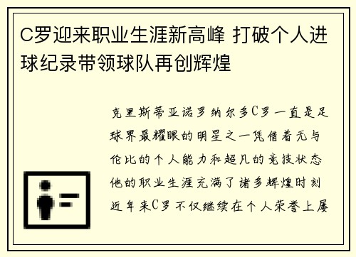 克里斯蒂亚诺·罗纳尔多(C罗)一直是足球界最耀眼的明星之一,凭借着无与伦比的个人能力和超凡的竞技状态,他的职业生涯充满了诸多辉煌时刻。近年来,C罗不仅继续在个人荣誉上屡创佳绩,更在球队中扮演着至关重要...