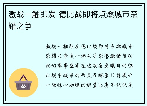 《激战一触即发,德比战即将点燃城市荣耀之争》是一场关乎荣誉、激情与对抗的赛事盛宴。在这场备受瞩目的德比战中,城市的两支足球豪门将展开一场惊心动魄的较量。比赛不仅仅是球场上的对抗,更是一场涉及城市荣耀、...