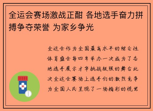 全运会作为全国最高水平的综合性体育盛会,每四年举办一次,成为了各地选手展示才华、挑战极限的舞台。此次全运会赛场上,选手们的激烈竞争为全国人民呈现了一场精彩的视觉盛宴。各地选手不仅奋力拼搏,争夺个人荣誉...