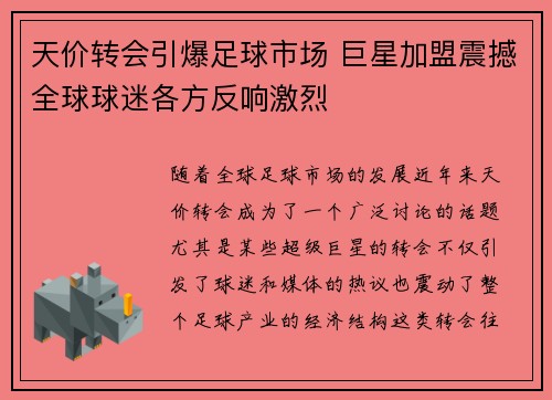 随着全球足球市场的发展,近年来天价转会成为了一个广泛讨论的话题。尤其是某些超级巨星的转会,不仅引发了球迷和媒体的热议,也震动了整个足球产业的经济结构。这类转会往往涉及极高的转会费、签约奖金和薪水,不仅...