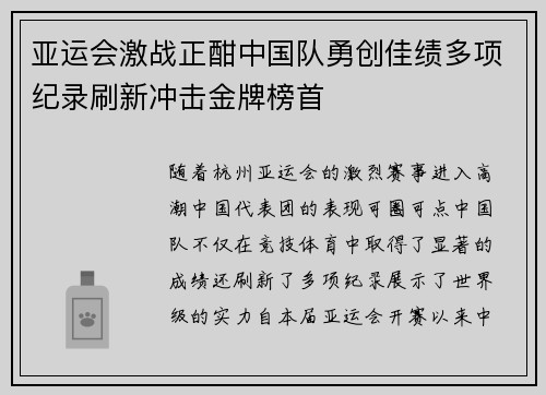 随着杭州亚运会的激烈赛事进入高潮,中国代表团的表现可圈可点。中国队不仅在竞技体育中取得了显著的成绩,还刷新了多项纪录,展示了世界级的实力。自本届亚运会开赛以来,中国队势如破竹,在多个项目中迎来了辉煌时...